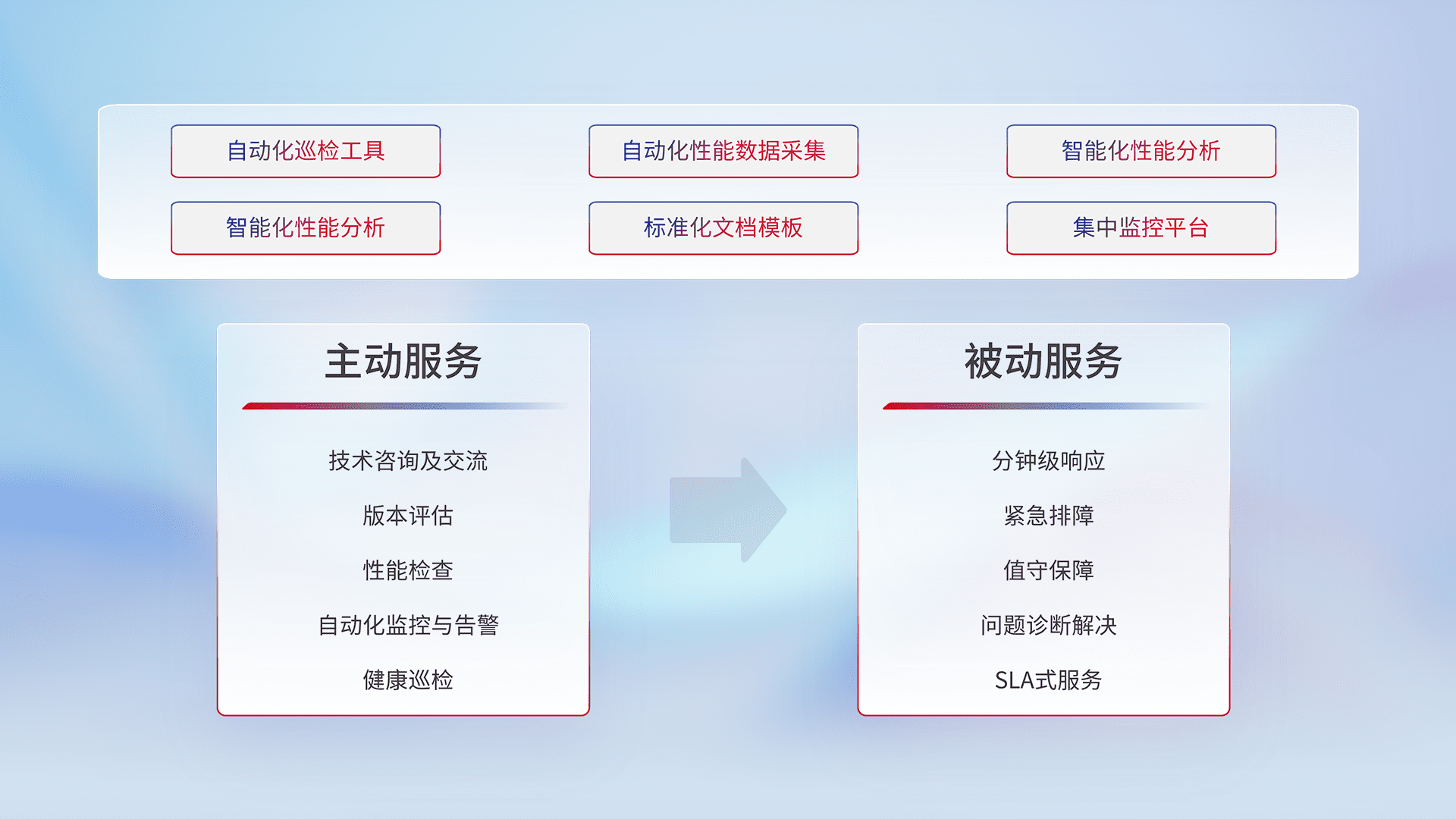 智能化工具和标准化文档,,,保障服务质量,,,提供主动服务(包含技术咨询、、、、版本评估、、性能检查、、、自动化监控与告警、、、、健康巡检)和被动服务包含(分钟级响应、、、、紧急排障、、、、值守保障、、、问题诊断解决、、、SLA服务)。。。